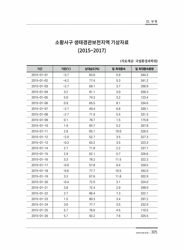 III. 부 록 www.nie.re.kr ?305 20152017 기간 기온 ℃ 상대습도 % 일 최대풍속 일 최대풍속풍향 2015-01-01 -3.7 63.0 5.9 344.3 2015-01-02 -4.2 77.4 5.3 341.2 2015-01-03 -2.7 69.1 3.7 200.9 2015-01-04 3.2 81.1 3.0 200.3 2015-01-05 5.0 74.3 3.2 123.4 2015-01-06 0.9 65.5 8.1 334.6 2015-01-07 -2.7 49.4 6.8 330.1 2015-01-08 -2.7 71.9 5.4 331.3 2015-01-09 0.1 78.7 1.5 175.8 2015-01-10 1.9 65.7 5.2 267.8 2015-01-11 2.9 65.1 10.0 32...