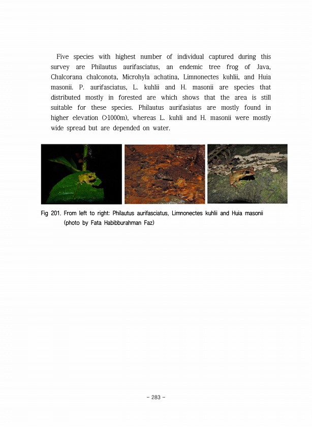 Five species with highest number of individual captured during this survey are Philautus aurifasciatus, an endemic tree frog of Java, Chalcorana chalconota, Microhyla achatina, Limnonectes kuhlii, and Huia masonii. P. aurifasciatus, L. kuhlii and H. masonii are species that distributed mostly in forested are which shows that the area is still suitable for these species. Philautus aurifasiatus are ...