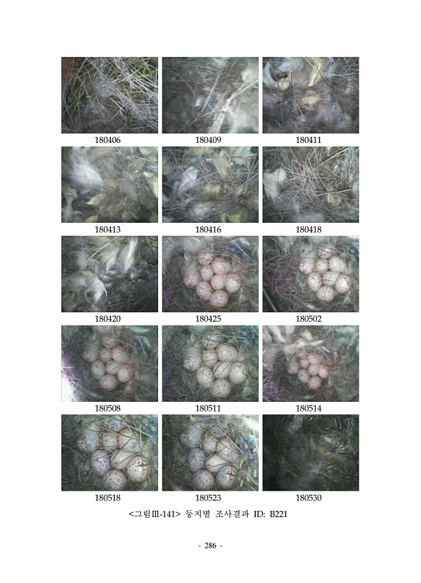 286 180406 180409 180411 180413 180416 180418 180420 180425 180502 180508 180511 180514 180518 180523 180530 그림Ⅲ-141 둥지별 조사결과 IDB221