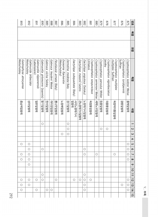 Ⅴ. 부록 292 번호 목명 과명 학명 국명 1 2 3 4 5 6 7 8 9 10 11 12 13 14 15 875 Cryptocephalus koltzei Weise 콜체잎벌레 ○ ○ ○ ○ ○ ○ ○ 876 Cryptocephalus luridipennis Suffrian 광릉잎벌레 ○ 877 Cryptocephalus multiplex multiplex Suffrian 육점박이통잎벌레 ○ 878 Cryptocephalus nigrofasciatus Jacoby 외줄통잎벌레 ○ 879 Cryptocephalus parvulus M?ller 등줄잎벌레 ○ 880 Cryptocephalus semenovi Weise 세메노브잎벌레 ○ 881 Cryptocephalus sexpunctaus Linnaeus 육...