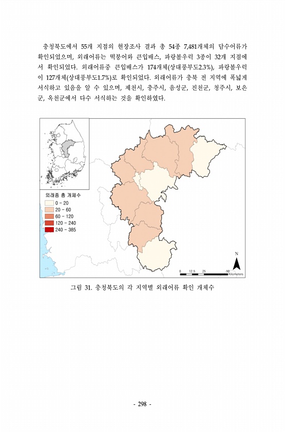298 충청북도에서 55개 지점의 현장조사 결과 총 54종 7,481개체의 담수어류가 확인되었으며, 외래어류는 떡붕어와 큰입배스, 파랑볼우럭 3종이 32개 지점에 서 확인되었다. 외래어류중 큰입배스가 174개체 상대풍부도2.3% , 파랑볼우럭 이 127개체 상대풍부도1.7% 로 확인되었다. 외래어류가 충북 전 지역에 폭넓게 서식하고 있음을 알 수 있으며, 제천시, 충주시, 음성군, 진천군, 청주시, 보은 군, 옥천군에서 다수 서식하는 것을 확인하였다. 그림 31. 충청북도의 각 지역별 외래어류 확인개체수