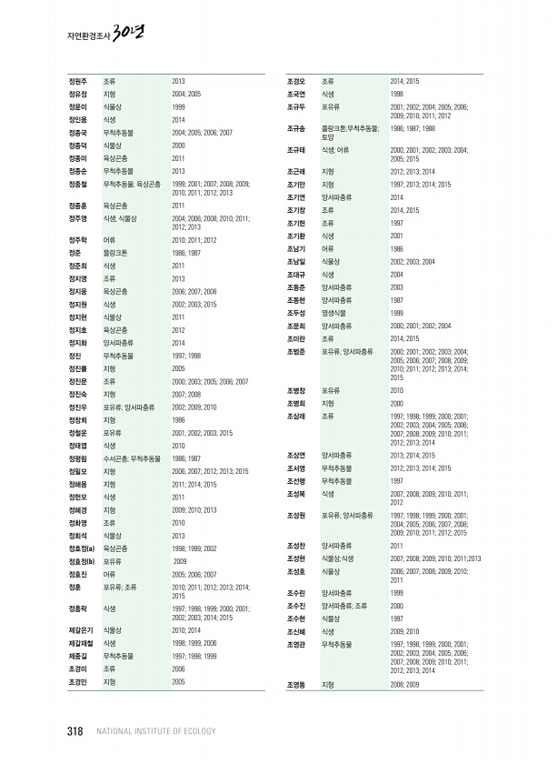 정원주 조류 2013 정유정 지형 2004; 2005 정윤미 식물상 1999 정인용 식생 2014 정종국 무척추동물 2004; 2005; 2006; 2007 정종덕 식물상 2000 정종미 육상곤충 2011 정종순 무척추동물 2013 정종철 무척추동물; 육상곤충 1999; 2001; 2007; 2008; 2009; 2010; 2011; 2012; 2013 정종훈 육상곤충 2011 정주영 식생; 식물상 2004; 2006; 2008; 2010; 2011; 2012; 2013 정주학 어류 2010; 2011; 2012 정준 플랑크톤 1986; 1987 정준희 식생 2011 정지영 조류 2013 정지웅 육상곤충 2006; 2007; 2008 정지원 식생 2002; 2003; 2015 정지현 식물상 2011 정지호 ...