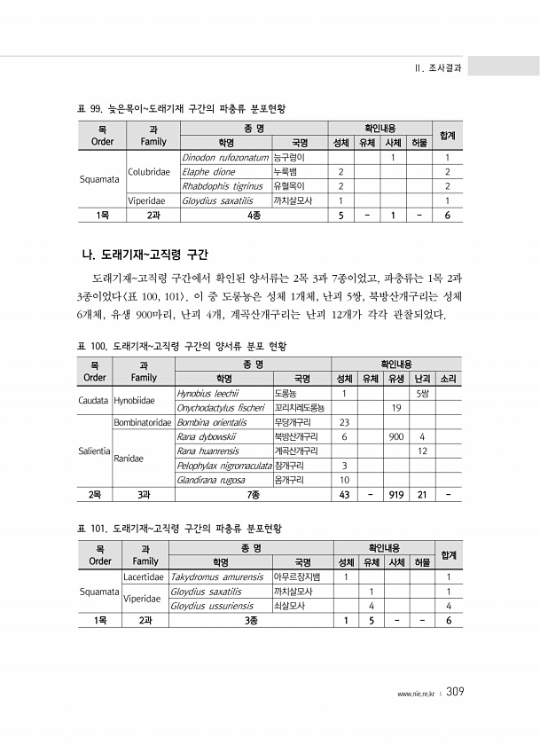 Ⅱ. 조사결과 www.nie.re.kr ? 309 표 99. 늦은목이도래기재 구간의 파충류 분포현황 목 Order 과 Family 종 명 확인내용 합계 학명 국명 성체 유체 사체 허물 Squamata Colubridae Dinodon rufozonatum 능구렁이 1 1 Elaphe dione 누룩뱀 2 2 Rhabdophis tigrinus 유혈목이 2 2 Viperidae Gloydius saxatilis 까치살모사 1 1 1목 2과 4종 5 1 6 나. 도래기재고직령 구간 도래기재고직령 구간에서 확인된 양서류는 2목 3과 7종이었고, 파충류는 1목 2과 3종이었다 표 100, 101 이 중 도롱뇽은 성체 1개체, 난괴 5쌍, 북방산개구리는 성체 6개체, 유생 900마리, 난괴 4개, 계곡산개구리는 난괴...