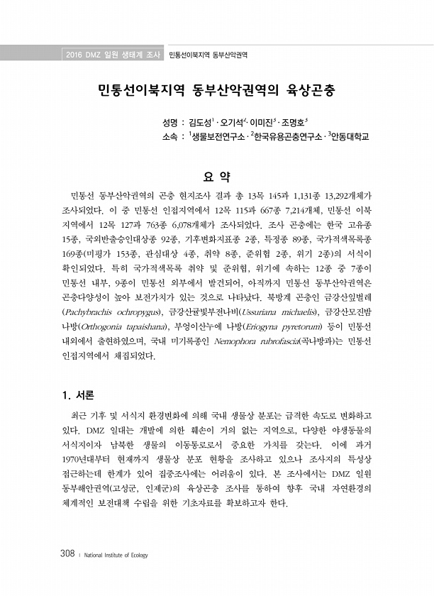 2016 DMZ 일원 생태계 조사 민통선이북지역 동부산악권역 308 ? National Institute of Ecology 민통선이북지역 동부산악권역의 육상곤충 성명 김도성1 ? 오기석2? 이미진3 ? 조명호3 소속 1생물보전연구소 ? 2한국유용곤충연구소 ? 3안동대학교 요 약 민통선 동부산악권역의 곤충 현지조사 결과 총 13목 145과 1,131종 13,292개체가 조사되었다. 이 중 민통선 인접지역에서 12목 115과 667종 7,214개체, 민통선 이북 지역에서 12목 127과 763종 6,078개체가 조사되었다. 조사 곤충에는 한국 고유종 15종, 국외반출승인대상종 92종, 기후변화지표종 2종, 특정종 89종, 국가적색목록종 169종 미평가 153종, 관심대상 4종, 취약 8종, 준위협 2종, 위기...