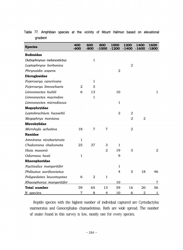 Species -600 400 -800 600 -1000 800 -1200 1000 -1400 1200 -1600 1400 -1800 1600 Bufonidae Duttaphrynus melanostictus 1 Leptophryne borbonica 2 Phrynoidis aspera 2 Dicroglosidae Fejervarya cancrivora 1 Fejervarya limnocharis 2 3 Limnonectes kuhlii 6 13 10 1 Limnonectes macrodon 1 Limnonectes microdiscus 1 Megophryidae Leptobrachium hasseltii 2 2 Megophrys montana 2 2 Microhylidae Microhyla achatina...