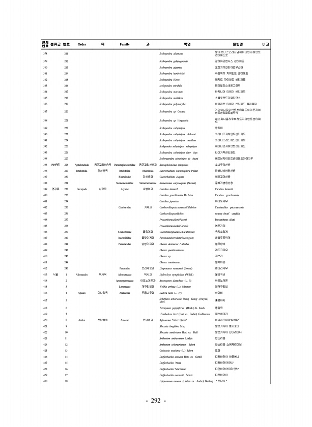 292 전체 번호 분류군 번호 Order 목 Family 과 학명 일반명 비고 378 211 Scolopendra alternans 알테르난스오리지널헤이티안자이언트 센티패드로 379 212 Scolopendra galapagoensis 갈라파고엔시스 센티패드 380 213 Scolopendra gigantea 오렌지기간티아로부스타 381 214 Scolopendra hardwickei 하드위키 자이언트 센티패드 382 215 Scolopendra Heros 데져트 자이언트 센티패드 383 216 scolopendra mirabilis 미라빌리스네온그린렉 384 217 Scolopendra morsitans 탄자니아 타이거 센티패드 385 218 Scolopendra multidens 스콜로팬드라멀티던스 38...