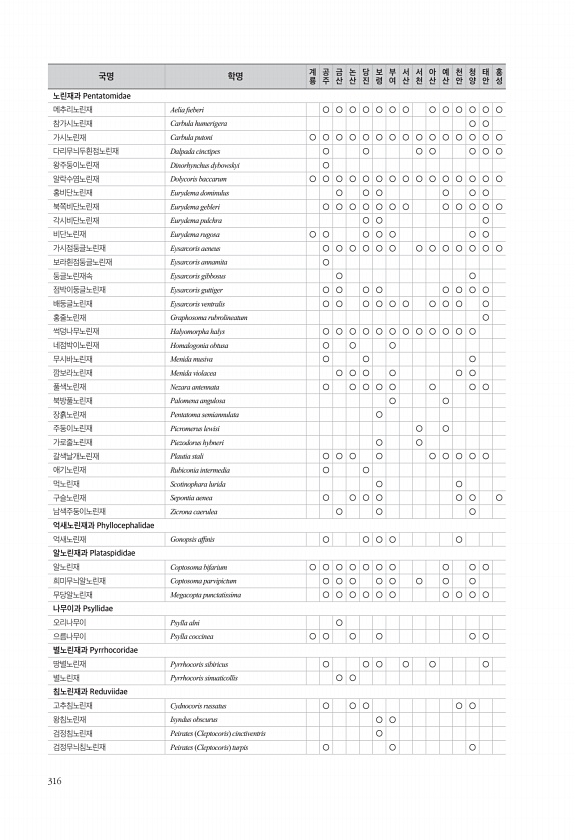 316 노린재과 Pentatomidae 메추리노린재 Aelia feberi ○ ○ ○ ○ ○ ○ ○ ○ ○ ○ ○ ○ ○ 참가시노린재 Carbula humerigera ○ ○ 가시노린재 Carbula putoni ○ ○ ○ ○ ○ ○ ○ ○ ○ ○ ○ ○ ○ ○ ○ 다리무늬두흰점노린재 Dalpada cinctipes ○ ○ ○ ○ ○ ○ ○ 왕주둥이노린재 Dinorhynchus dybowskyi ○ 알락수염노린재 Dolycoris baccarum ○ ○ ○ ○ ○ ○ ○ ○ ○ ○ ○ ○ ○ ○ ○ 홍비단노린재 Eurydema dominulus ○ ○ ○ ○ ○ ○ 북쪽비단노린재 Eurydema gebleri ○ ○ ○ ○ ○ ○ ○ ○ ○ ○ ○ ○ 각시비단노린재 Eurydema pulchra ○ ○ ○ ...