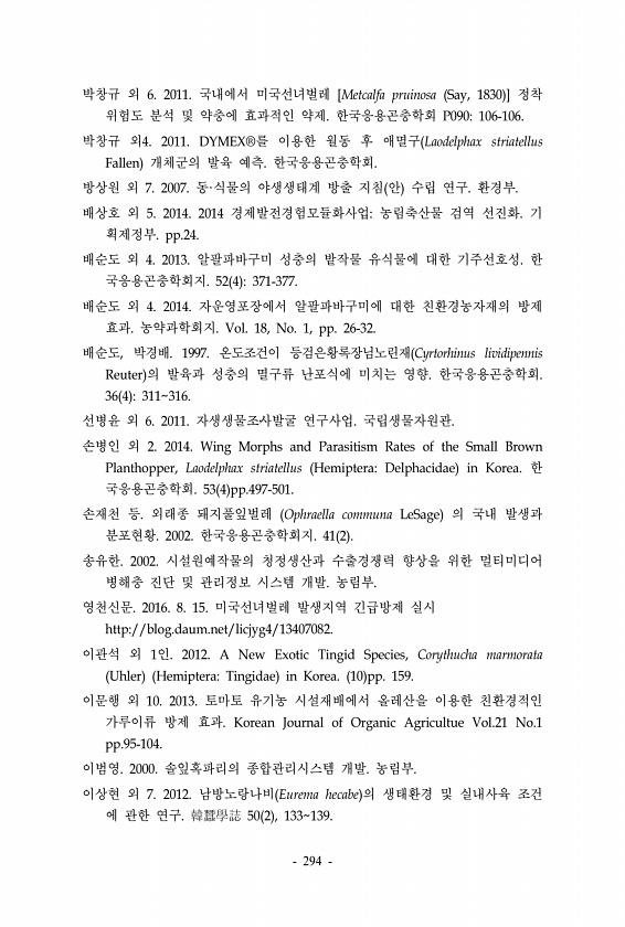 박창규 외 6. 2011. 국내에서 미국선녀벌레 [Metcalfa pruinosa Say, 1830 ] 정착 위험도 분석 및 약충에 효과적인 약제. 한국응용곤충학회 P090106-106. 박창규 외4. 2011. DYMEX®를 이용한 월동 후 애멸구 Laodelphax striatellus Fallen 개체군의 발육 예측. 한국응용곤충학회. 방상원 외 7. 2007. 동·식물의 야생생태계 방출 지침 안 수립 연구. 환경부. 배상호 외 5. 2014. 2014 경제발전경험모듈화사업농림축산물 검역 선진화. 기 획제정부. pp.24. 배순도 외 4. 2013. 알팔파바구미 성충의 밭작물 유식물에 대한 기주선호성. 한 국응용곤충학회지. 52 4 371-377. 배순도 외 4. 2014. 자운영포장에서 알팔파바구미에...