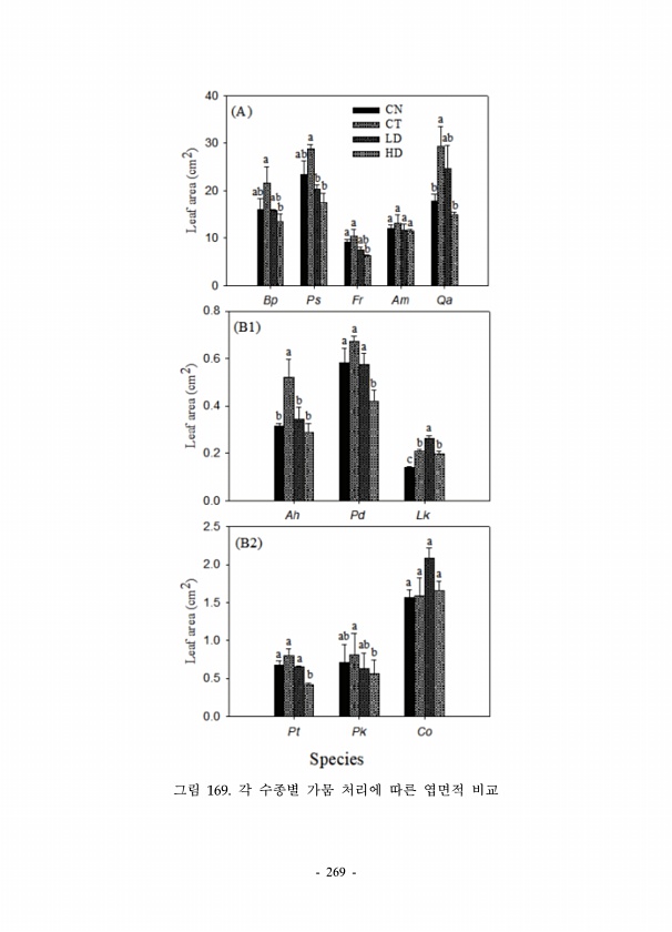 269 그림 169. 각 수종별 가뭄 처리에 따른 엽면적비교