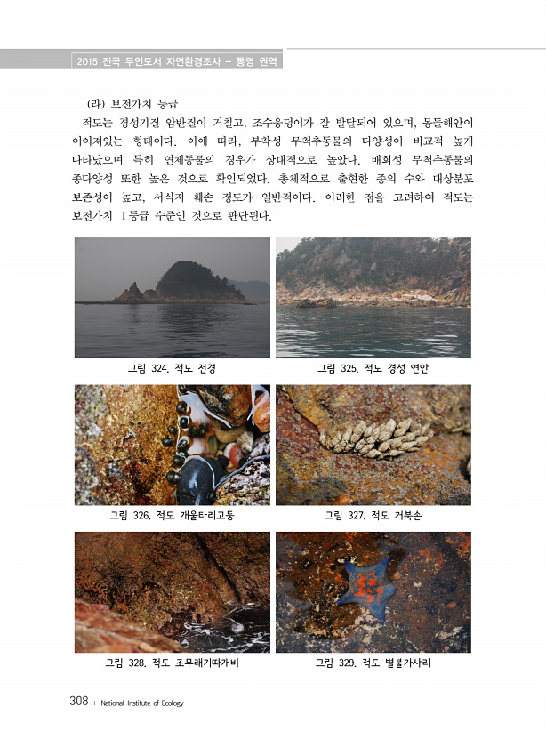 2015 전국 무인도서 자연환경조사 통영 권역 308 ? National Institute of Ecology 라 보전가치 등급 적도는 경성기질 암반질이 거칠고, 조수웅덩이가 잘 발달되어 있으며, 몽돌해안이 이어져있는 형태이다. 이에 따라, 부착성 무척추동물의 다양성이 비교적 높게 나타났으며 특히 연체동물의 경우가 상대적으로 높았다. 배회성 무척추동물의 종다양성 또한 높은 것으로 확인되었다. 총체적으로 출현한 종의 수와 대상분포 보존성이 높고, 서식지 훼손 정도가 일반적이다. 이러한 점을 고려하여 적도는 보전가치 Ⅰ등급 수준인 것으로 판단된다. 그림 324. 적도 전경 그림 325. 적도 경성 연안 그림 326. 적도 개울타리고둥 그림 327. 적도 거북손 그림 328. 적도 조무래기따개비 그림 329. 적...