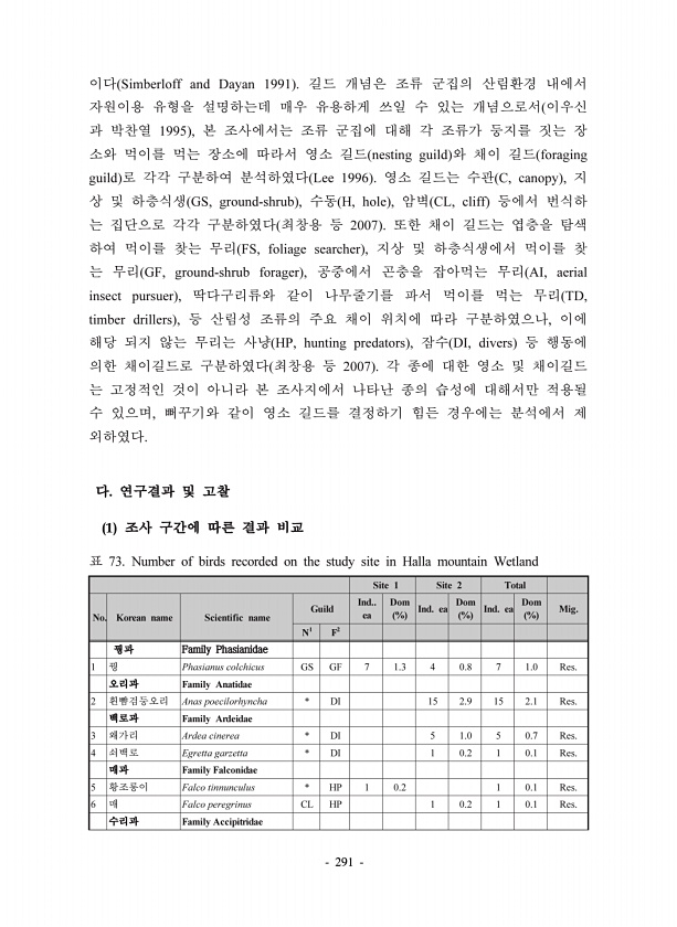 291 Simberloff and Dayan 1991 1995 , nesting guild foraging guild Lee 1996 C, canopy , GS, ground-shrub , H, hole , CL, cliff 2007 FS, foliage searcher , GF, ground-shrub forager , AI, aerial insect pursuer , TD, timber drillers , , HP, hunting predators , DI, divers 2007 , 1 73. Number of birds recorded on the study site in Halla mountain Wetland Site 1 Site 2 Total No. Korean name Scientific nam...