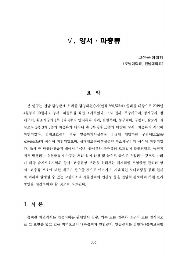 306 Ⅴ. 양서·파충류 고선근·이해범 호남대학교, 전남대학교 요 약 본 연구는 전남 담양군에 위치한 담양하천습지 면적 980,575㎡ 일대를 대상으로 2019년 4월부터 10월까지 양서·파충류를 직접 조사하였다. 조사 결과, 무당개구리, 청개구리, 참 개구리, 황소개구리 1목 3과 4종의 양서류와 자라, 유혈목이, 능구렁이, 구렁이, 살모사, 쇠 살모사 2목 3과 6종의 파충류가 나타나 총 3목 6과 10종의 다양한 양서·파충류의 서식이 확인되었다. 법정보호종의 경우 멸종위기야생생물 Ⅱ급에 해당하는 구렁이 Elaphe schrenckii 의 서식이 확인되었으며, 생태계교란야생생물인 황소개구리의 서식이 확인되었 다. 조사 중 담양하천습지 내에서 다수의 양서류와 파충류의 로드킬이 확인되었고, 농경지 에서 발생...