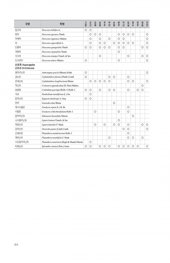 314 둥근마 Dioscorea bulbifera L. ○ ○ 참마 Dioscorea japonica Thunb. ○ ○ ○ ○ ○ ○ ○ ○ 부채마 Dioscorea nipponica Makino ○ ○ ○ ○ ○ ○ 마 Dioscorea oppositifolia L. ○ ○ ○ ○ ○ ○ ○ ○ ○ 단풍마 Dioscorea quinqueloba Thunb. ○ ○ ○ ○ ○ ○ ○ ○ ○ 국화마 Dioscorea septemloba Thunb. ○ 각시마 Dioscorea tenuipes Franch. & Sav. ○ ○ ○ ○ 도꼬로마 Dioscorea tokoro Makino ○ ○ ○ 난초목 Asparagales 난초과 Orchidaceae 병아리난초 Amitostigma gracile Blume ...