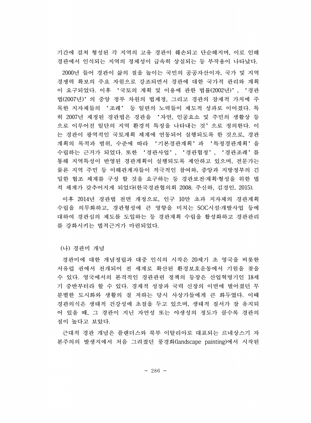 286 기간에 걸쳐 형성된 각 지역의 고유 경관이 훼손되고 단순해지며, 이로 인해 경관에서 인식되는 지역의 정체성이 급속히 상실되는 등 부작용이 나타났다. 2000년 들어 경관이 삶의 질을 높이는 국민의 공공자산이자, 국가 및 지역 경쟁력 확보의 주요 자원으로 강조되면서 경관에 대한 국가적 관리와 계획 이 요구되었다. 이후 ‘국토의 계획 및 이용에 관한 법률 2002년 ’, ‘경관 법 2007년 ’의 중앙 정부 차원의 법제정, 그리고 경관의 잠재적 가치에 주 목한 지자체들의 ‘조례’ 등 일련의 노력들이 제도적 성과로 이어졌다. 특 히 2007년 제정된 경관법은 경관을 ‘자연, 인공요소 및 주민의 생활상 등 으로 이루어진 일단의 지역 환경적 특징을 나타내는 것’으로 정의한다. 이 는 경관이 광역적인 국토계획 ...