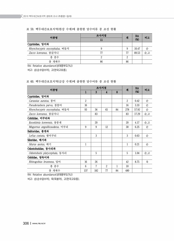 2016 백두대간보호지역 생태계 조사 추풍령밀재 306Ⅰwww.nie.re.kr 표 59. 백두대간보호지역 한강 수계 에 출현한 담수어류 종 조성 현황 어종명 조사지점 계 RA 11 % 비고 Cyprinidae, 잉어과 Rhynchocypris oxycephalus, 버들치 9 9 10.47 순 Zacco koreanus, 참갈겨니 77 77 89.53 순,고 총 종수 2 2 총 개체수 86 86 RARelative abundance 상대풍부도 % 비고순 순수담수어 , 고 한국고유종 표 60. 백두대간보호지역 금강 수계 에 출현한 담수어류 종 조성 현황 어종명 조사지점 계 RA 1 3 4 8 % 비고 Cyprinidae, 잉어과 Carassius auratus, 붕어 2 2 0.42 순 Pseudorasbo...