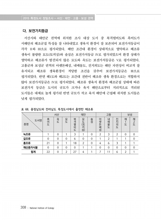 2015 특정도서 정밀조사 서산·태안·고흥·보성 권역 308 ? National Institute of Ecology 다. 보전가치등급 서산시와 태안군 권역에 위치한 조사 대상 도서 중 북격렬비도와 흑어도가 서해안의 해조군집 특성을 잘 나타내었고 생육지 환경이 잘 보존되어 보전가치등급이 각각 Ⅱ와 III으로 평가되었다. 해안 조간대 환경이 상대적으로 열악하고 해조류 생육이 불량한 묘도 토끼섬 와 솔섬은 보전가치등급 Ⅳ로 평가되었으며 환경 상태가 열악하고 해조류가 발견되지 않은 묘도와 옥도는 보전가치등급은 V로 평가되었다. 고흥군과 보성군 권역의 아랫돈배섬, 내매물도, 진지외도는 해안 자연성이 비교적 잘 유지되고 해조류 생육환경이 적당한 조건을 갖추어 보전가치등급은 Ⅲ으로 평가되었다. 반면 해1도와 해2도는 ...