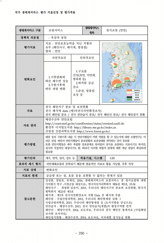 국가 생태계서비스 평가 지표선정 및 평가적용 290 생태계서비스 구분 조절서비스 생태계서비스 항목 침식조절 연안 정책적 의문점 육상과 동일 평가지표 지표 연안보호능력을 지닌 지형의 유무 해안사구, 해식애, 방풍림 범위 연안 변화요인 자연적요인 인위적요인 1.기후변화에 따른 해수면 상승 2.극한기후에 따른 파랑 변화 1.구조물 건설 호안, 이안제, 방파제 등 2.퇴적물 공급 감소 3.준설, 방품림 조성 등 자료 전국 해안사구 분포 및 보전현황 전국 해식애 data 제3차전국자연환경조사 전국 해안림 분포 전국 연안습지 분포/ 전국 해안선 분포/ 전국 해안침식 현황 자료 관리 해양수산부 연안포털 http//coast.mof.go.kr/coastErosion/status/erosionLoad1.do 환경부 디지털도...