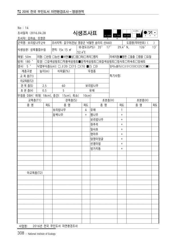 2016 전국 무인도서 자연환경조사 영광권역 308 ? National Institute of Ecology No 14 조사일자 2016.04.28 조사자김하송, 조영준 식생조사표 군락명보리밥나무군락 조사지역갈구여 전남 영광군 낙월면 송이리 산460 도엽명 격자번호 식생상관상록활엽수림 면적15x 15 ㎡ 위?경도 GPS 35° 17′ 29.4″N, 126° 13′ 52.4E 해발50m 지형□산정 □능선 ■사면 ■상□중□하 □계곡□평지 미세지형■평면 □돌출 □함몰 □요철 방위180 ° 토양□갈색삼림토□적황색삼림토■암적색삼림토□회갈색삼림토□침식토□미숙토□암쇄토 경사5 ° 낙엽부식층 cm □.≥20 □ 15 □ 10 ■ 5 □0 암석노출 % □≥51□ 50□ 25□ 5■0 계층구분 높이 m 식피율 % 우점종 교 ...