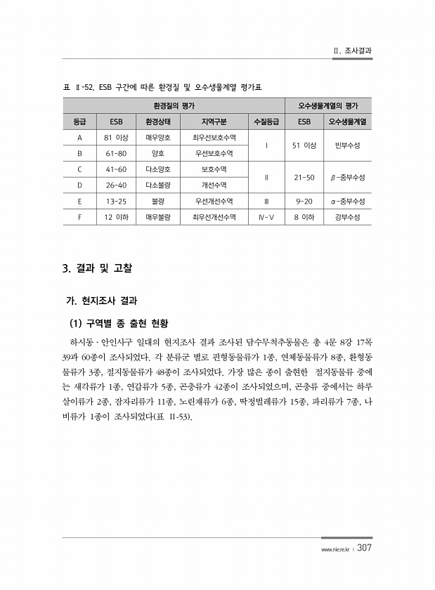Ⅱ. 조사결과 www.nie.re.kr ? 307 환경질의 평가 오수생물계열의 평가 등급 ESB 환경상태 지역구분 수질등급 ESB 오수생물계열 A 81 이상 매우양호 최우선보호수역 Ⅰ 51 이상 빈부수성 B 61-80 양호 우선보호수역 C 41-60 다소양호 보호수역 Ⅱ 21-50 β-중부수성 D 26-40 다소불량 개선수역 E 13-25 불량 우선개선수역 Ⅲ 9-20 α-중부수성 F 12 이하 매우불량 최우선개선수역 Ⅳ-Ⅴ 8 이하 강부수성 표 Ⅱ-52. ESB 구간에 따른 환경질 및 오수생물계열 평가표 3. 결과 및 고찰 가. 현지조사 결과 1 구역별 종 출현 현황 하시동·안인사구 일대의 현지조사 결과 조사된 담수무척추동물은 총 4문 8강 17목 39과 60종이 조사되었다. 각 분류군 별로 편형동물류가 ...