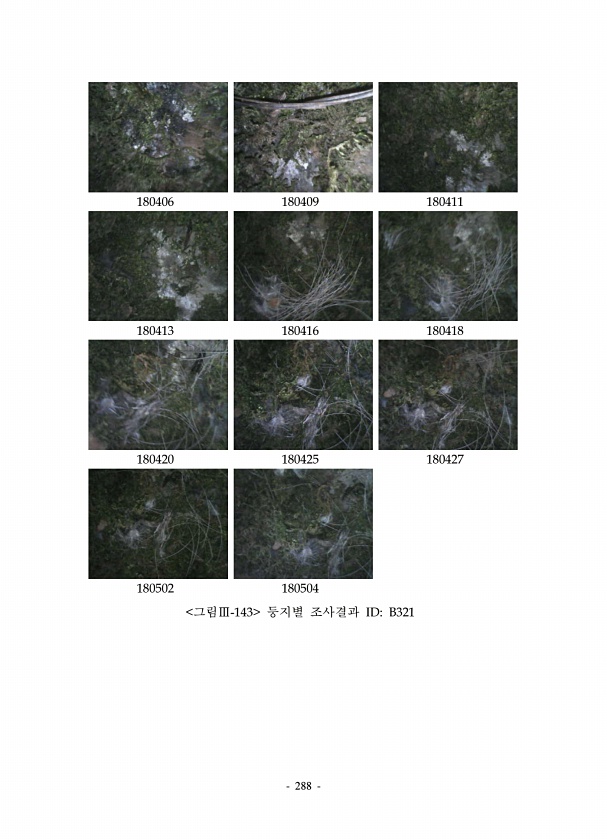 288 180406 180409 180411 180413 180416 180418 180420 180425 180427 180502 180504 그림Ⅲ-143 둥지별 조사결과 IDB321