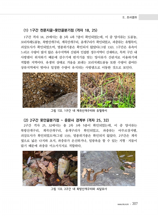 Ⅱ. 조사결과 www.nie.re.kr ? 307 1 1구간 천문지골못안골분기점 격자 18, 25 1구간 격자 18, 25에서는 총 3목 4과 7종이 확인되었는데, 이 중 양서류는 도롱뇽, 꼬리치레도롱뇽, 북방산개구리, 계곡산개구리, 옴개구리가 확인되었고, 파충류는 유혈목이, 쇠살모사가 확인되었으며, 멸종위기종은 확인되지 않았다 그림 132 1구간은 유속이 느리고 수량이 많지 않은 유수지역과 산림과 인접한 정수지역이 산재하고, 특히 구간 내 사방댐이 위치하기 때문에 갈수기에 번식기를 맞는 양서류가 산란지로 이용하기에 적합한 지역이다. 유생의 상태로 겨울을 보내는 꼬리치레도롱뇽 또한 수량이 줄어든 상류지역에서 벗어나 일정한 수량이 유지되는 사방댐으로 이동한 것으로 보인다. 그림 132. 1구간 내 계곡산개구리...