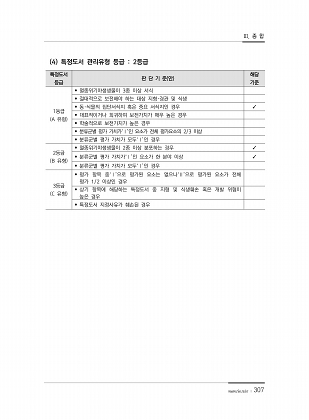 Ⅲ. 종 합 www.nie.re.kr ? 307 4 특정도서 관리유형 등급 2등급 특정도서 등급 판 단 기 준 안 해당 기준 1등급 A 유형 ? 멸종위기야생생물이 3종 이상 서식 ? 절대적으로 보전해야 하는 대상 지형·경관 및 식생 ? 동·식물의 집단서식지 혹은 중요 서식지인 경우 ? ? 대표적이거나 희귀하여 보전가치가 매우 높은 경우 ? 학술적으로 보전가치가 높은 경우 ? 분류군별 평가 가치가‘Ⅰ’인 요소가 전체 평가요소의 2/3 이상 ? 분류군별 평가 가치가 모두‘Ⅰ’인 경우 2등급 B 유형 ? 멸종위기야생생물이 2종 이상 분포하는 경우 ? ? 분류군별 평가 가치가‘Ⅰ’인 요소가 한 분야 이상 ? ? 분류군별 평가 가치가 모두‘Ⅰ’인 경우 3등급 C 유형 ? 평가 항목 중‘Ⅰ’으로 평가된 요소는 없으나‘...