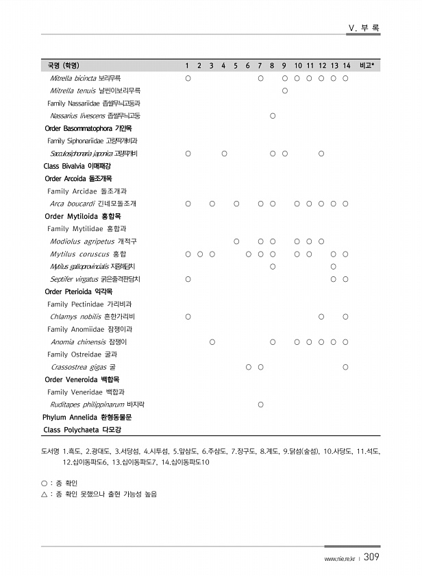 Ⅴ. 부 록 www.nie.re.kr ? 309 국명 학명 1 2 3 4 5 6 7 8 9 10 11 12 13 14 비고* Mitrella bicincta 보리무륵 ○ ○ ○ ○ ○ ○ ○ ○ Mitrella tenuis 날씬이보리무륵 ○ Family Nassariidae 좁쌀무늬고둥과 Nassarius livescens 좁쌀무늬고둥 ○ Order Basommatophora 기안목 Family Siphonariidae 고랑딱개비과 Sacculosiphonaria japonica 고랑딱개비 ○ ○ ○ ○ ○ Class Bivalvia 이매패강 Order Arcoida 돌조개목 Family Arcidae 돌조개과 Arca boucardi 긴네모돌조개 ○ ○ ○ ○ ○ ○ ○ ○ ○ ○ Order Mytiloi...