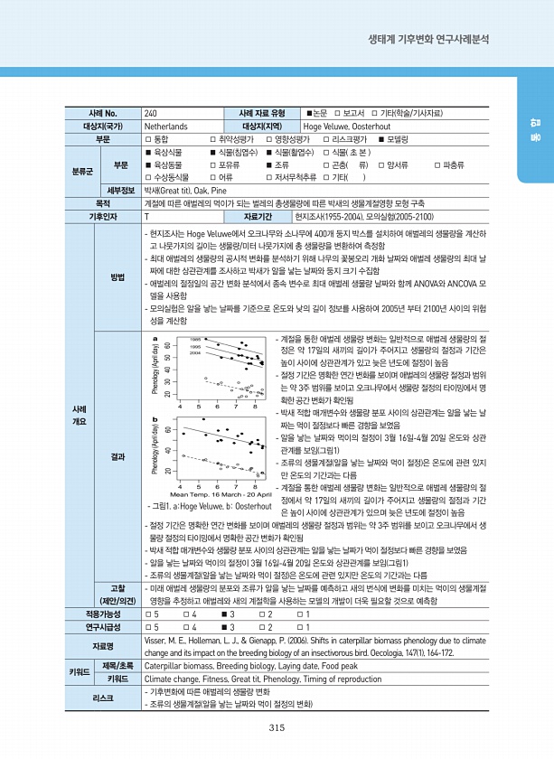 315 생태계 기후변화 연구사례분석 통 합 사례 No. 240 사례 자료 유형 ■논문 □ 보고서 □ 기타 학술/기사자료 대상지 국가 Netherlands 대상지 지역 Hoge Veluwe, Oosterhout 부문 □ 통합 □ 취약성평가 □ 영향성평가 □ 리스크평가 ■ 모델링 분류군 부문 ■ 육상식물 ■ 식물 침엽수 ■ 식물 활엽수 □ 식물 초 본 ■ 육상동물 □ 포유류 ■ 조류 □ 곤충 류 □ 양서류 □ 파충류 □ 수상동식물 □ 어류 □ 저서무척추류 □ 기타 세부정보 박새 Great tit , Oak, Pine 목적 계절에 따른 애벌레의 먹이가 되는 벌레의 총생물량에 따른 박새의 생물계절영향 모형 구축 기후인자 T 자료기간 현지조사 1955-2004 , 모의실험 2005-2100 사례 개요 방법 현지조사는...