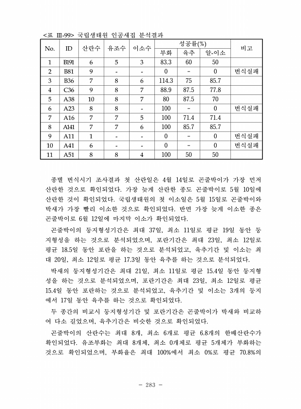 283 표 Ⅲ-99 국립생태원 인공새집 분석결과 No. ID 산란수 유조수 이소수 성공률 % 비고 부화 육추 알-이소 1 B191 6 5 3 83.3 60 50 2 B81 9 0 0 번식실패 3 B36 7 8 6 114.3 75 85.7 4 C36 9 8 7 88.9 87.5 77.8 5 A38 10 8 7 80 87.5 70 6 A23 8 8 100 0 번식실패 7 A16 7 7 5 100 71.4 71.4 8 A141 7 7 6 100 85.7 85.7 9 A11 1 0 0 번식실패 10 A41 6 0 0 번식실패 11 A51 8 8 4 100 50 50 종별 번식시기 조사결과 첫 산란일은 4월 14일로 곤줄박이가 가장 먼저 산란한 것으로 확인되었다. 가장 늦게 산란한 종도 곤줄박이로 5월 10일에 산란...