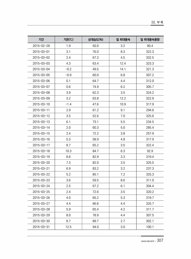 III. 부 록 www.nie.re.kr ?307 기간 기온 ℃ 상대습도 % 일 최대풍속 일 최대풍속풍향 2015-02-28 1.9 50.0 3.2 90.4 2015-03-01 3.1 76.0 8.3 322.3 2015-03-02 2.4 67.3 4.5 332.5 2015-03-03 4.3 63.4 12.4 323.3 2015-03-04 -0.2 49.5 14.1 321.3 2015-03-05 -0.9 60.0 6.8 307.2 2015-03-06 0.1 64.7 4.4 312.0 2015-03-07 0.6 74.9 6.2 305.7 2015-03-08 3.9 62.3 3.5 324.2 2015-03-09 3.2 63.8 12.2 322.9 2015-03-10 -1.4 47.6 10.9 317.9 2015-...