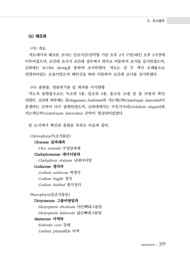Ⅱ. 조사결과 www.nie.re.kr ? 309 6 해조류 가 개요 적도에서의 해조류 조사는 간조시간 삼덕항 기준 오후 2시 17분 대인 오후 2시경에 이루어졌으며, 조간대 조사시 조간대 상부에서 하부로 이동하며 조사를 실시하였으며, 조하대는 SCUBA diving을 통하여 조사하였다. 적도는 섬 두 개가 모래톱으로 연결되어있는 모습이었으며 해안선을 따라 이동하며 조간대 조사를 실시하였다. 나 출현종, 멸종위기종 및 희귀종 서식현황 적도의 출현종으로는 녹조류 5종, 갈조류 6종, 홍조류 24종 등 총 35종의 확인 되었다. 조간대 하부에는 톳 Sargassum fusiforme 과 가는개도박 Grateloupia lanceolata 이 혼생하는 군락이 다수 출현하였으며, 조하대에서는 우뭇가사리 Gelidi...